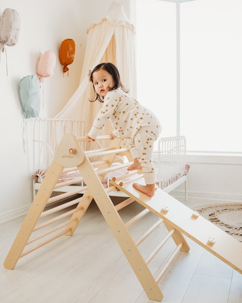 Be it the couch, the kitchen table, or the bookshelf, kids are gonna climb. You may as well provide the space to do it. The Pikler Climber Set was made for grasping and climbing and practicing these new skills. The set includes the Pikler Triangle and a reversible rockwall/slide ramp.