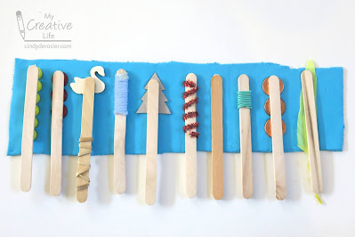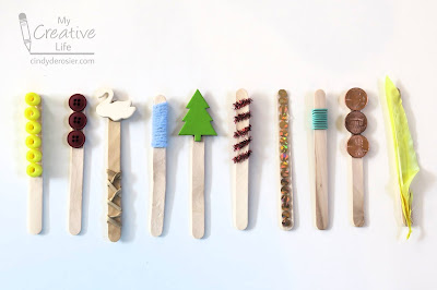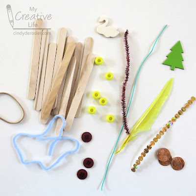 Next, I attached each item (pony beads, buttons, a wooden swan, a rubber band, yarn, a chipboard tree, pipe cleaner, a shiny trim, Twisteezwire, pennies, and a feather) to craft sticks. I used hot glue for everything except the rubber band, pipe cleaner, and Twisteezwire, which I just wrapped around their craft sticks.