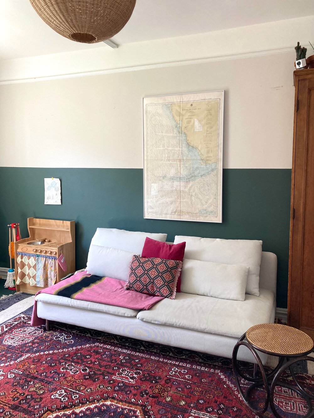 We decided to conceptualize the two rooms in the apartment as living spaces vs bedrooms, one for adults and one for kids. Both rooms have sofas and we just each sleep in our respective living spaces. This allows me to close the door to all the toys and chaos of the playroom at night and watch TV in peace- without a bunch of farm animals looking back at me. It also means that my son's toys don't have to fit in "my aesthetic" because they're not overwhelming the adult living spaces. Having this division of space has definitely helped us feel less overwhelmed by our lack of square footage.