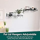 Strong construction perfectly match your home this cookware organizer made by heavy duty iron with black spray painting It s very firm and elegant Solid triangular design which is more stable and less likely to fall Black spray painting makes pot lid rack not easy to rustMatte black perfectly match with any decoration of home design Pot and pot lid twoinone rack the l 3169 w 1378 kitchen pot and pot lids organizer is highquality and comes with hooksTo orderly keep your pots pans utensils apron oven mitt and gloves while safely storing your fragile lids on top of the rack And you can place towels on the rod when the hooks are removed