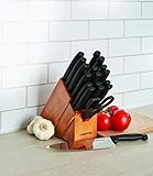 18 piece block set 8inch chef knife 8inch slicer 75inch bread knife 6inch boning knife 5inch utility knife 4inch vegetable knife 4inch tomato knife 3inch cheese knife 3inch parer 6 steak knives and a pair of kitchen scissors with a natural finish wood storage block Optimal sharpness kitchen knives never needs sharpening blades have micro serrations that make cutting easy blades are crafted from superior high carbon stainless steel for strength durability and precision results