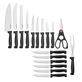 Full knife sets the 16piece block set includes all the essential pieces you need in a knife set 8 chef knife 8 carving knife 6 boning knife 55 carving fork 55 bread knife 55 santoku knife 45 steak knife 6 piece 35 birds beak paring knife shears and a sharpening steelall stored in a classic countertop storage block Lightweight and comfortable curved and tapered handle is very comfortable to hold Soft comfortable handles ensure a sold and safe grip hollow handle design wont feel too heavy Hand wash and dry dont put in dishwasher